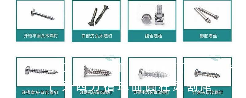 1、Flat:平頭 (鎖入后,頂部與工作件齊平)2、Oval:色拉頭、O頭、半沉頭 3、Round:圓頭 4、Pan:圓扁頭 5、Truss:大圓扁頭 6、Hex:六角頭 A-5:Finish Code/外觀處理。公制自攻螺絲 :于品名后方直接標(biāo)示 Tapp 主要分類包括普通螺絲、機(jī)螺絲、自攻螺絲和膨脹螺絲三種。 有頭螺釘Cap screw 過去限于全牙的扣件。 六角頭螺釘Hex cap screw與大六角螺栓Hex bolt 顧名思義為頭部為六角型的外螺紋扣件,設(shè)計(jì)為使用扳手轉(zhuǎn)動(dòng)。依照ASME B18.2.1標(biāo)準(zhǔn),六